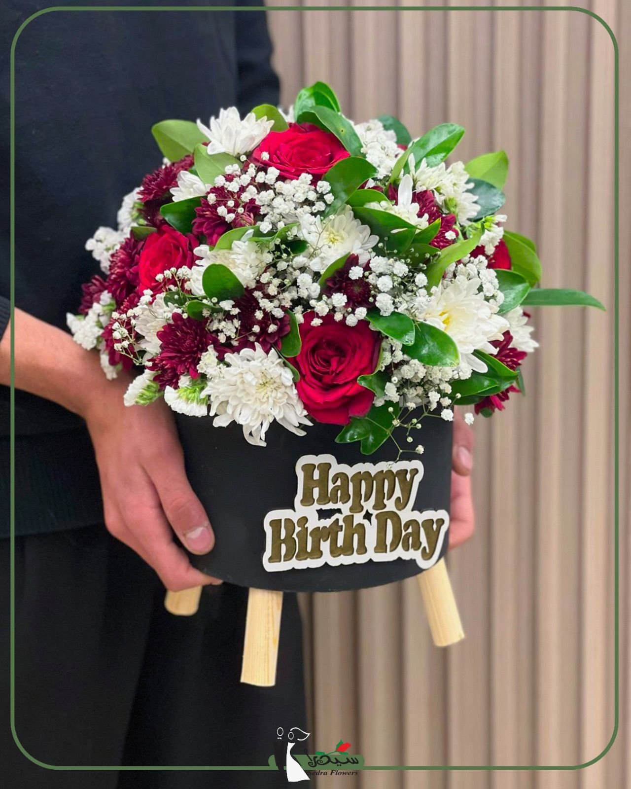 A vibrant arrangement of red flowers paired with a delicious cake and festive balloons a delightful trio to celebrate joy, love, Birthdays.