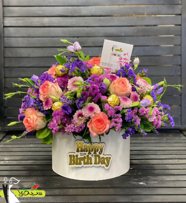 A charming arrangement of purple and pink flowers in a rounded box, a delightful surprise that brings joy and elegance to the birthday celebration.