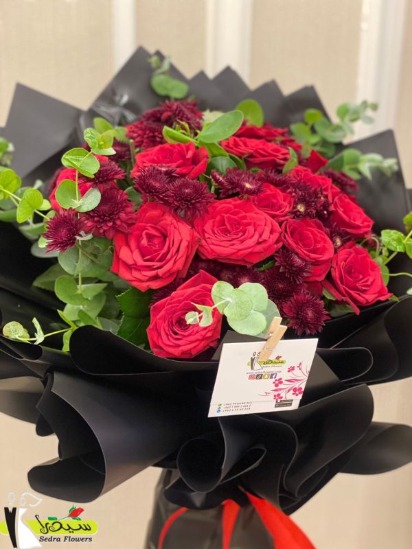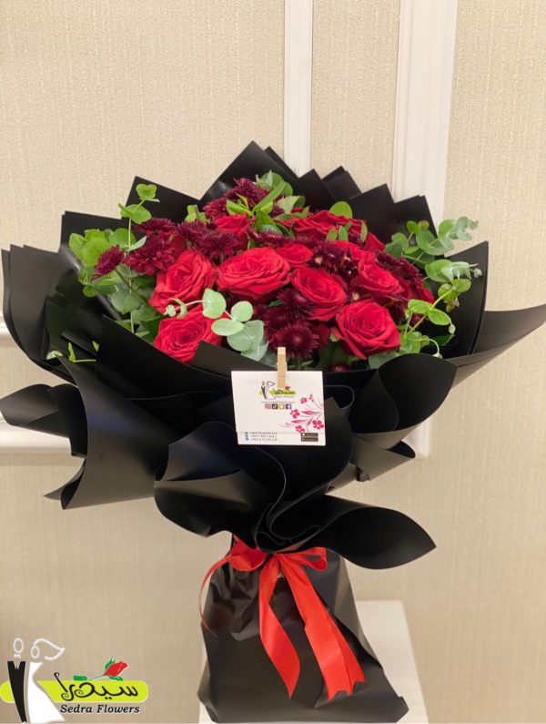 A striking bouquet of red roses elegantly wrapped in black, a timeless expression of love and style. Unveil the beauty within, where romance meets refinement