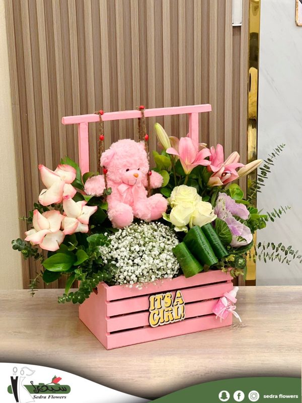 Baby girl arrangement with white flowers, baby’s breath, and a pink teddy bear.
