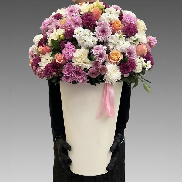 A large white vase decorated with a wonderful assortment of pink and white flowers.