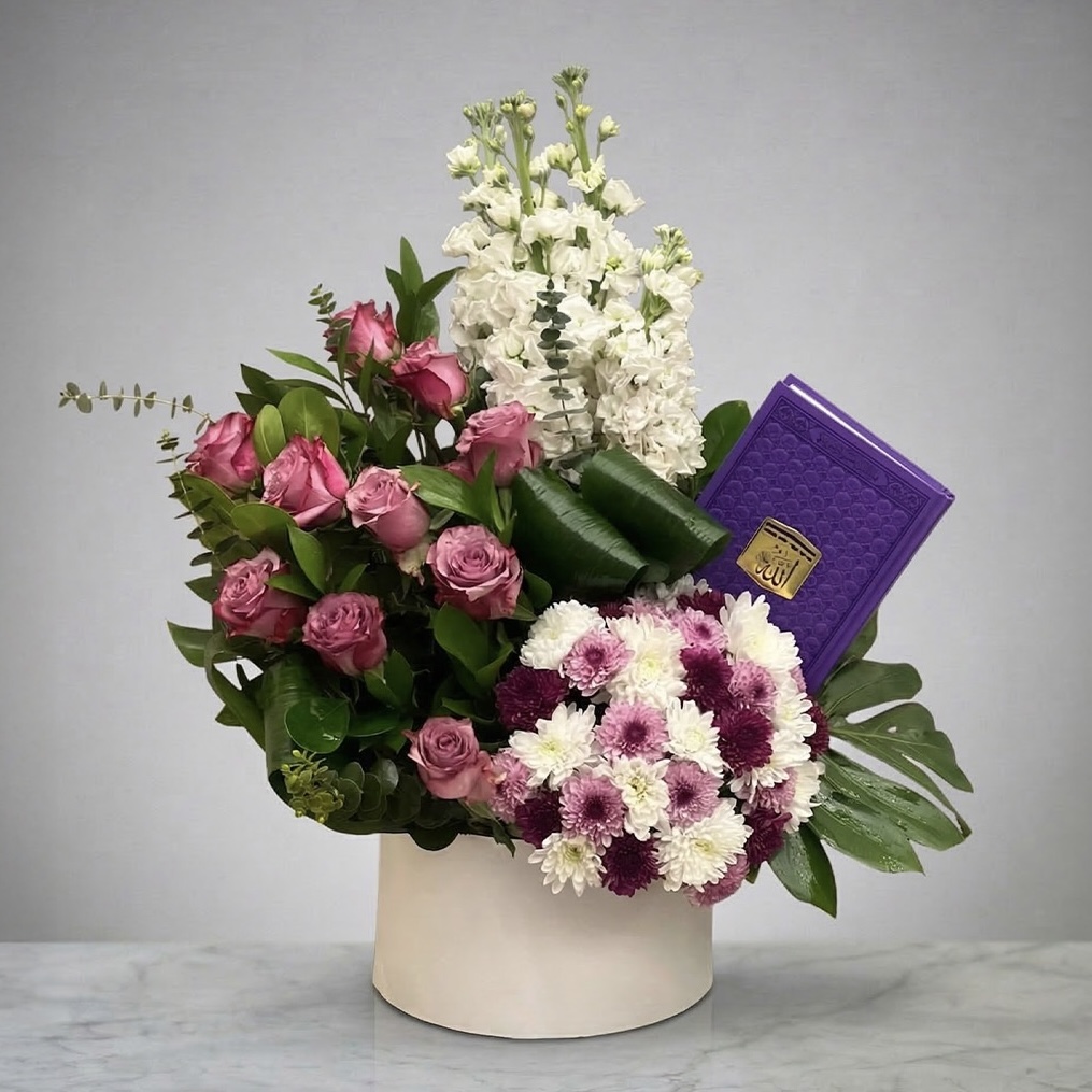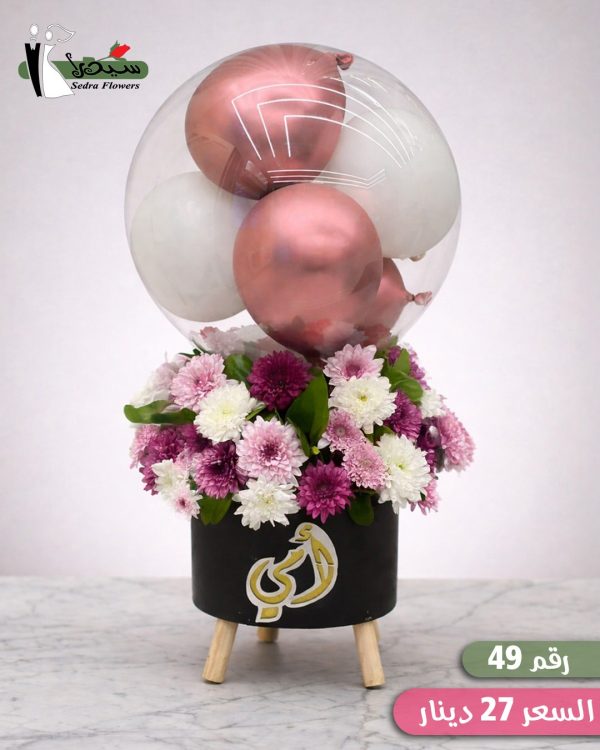 Black base with a mix of pink and white flowers, ‘Mom’ sticker and balloon.
