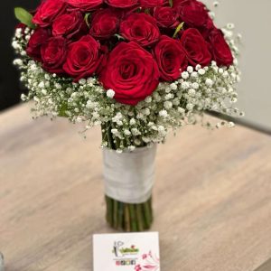 Radiate purity and grace with this enchanting mix of white roses, lilium, and gypsophila—a bridal bouquet that captures the essence of love in its purest form.