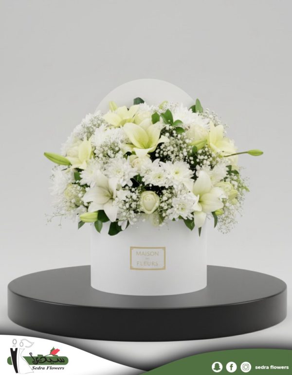 A luxurious white box filled with radiant white flowers, embodying elegance and purity. An ideal gift for any occasion.