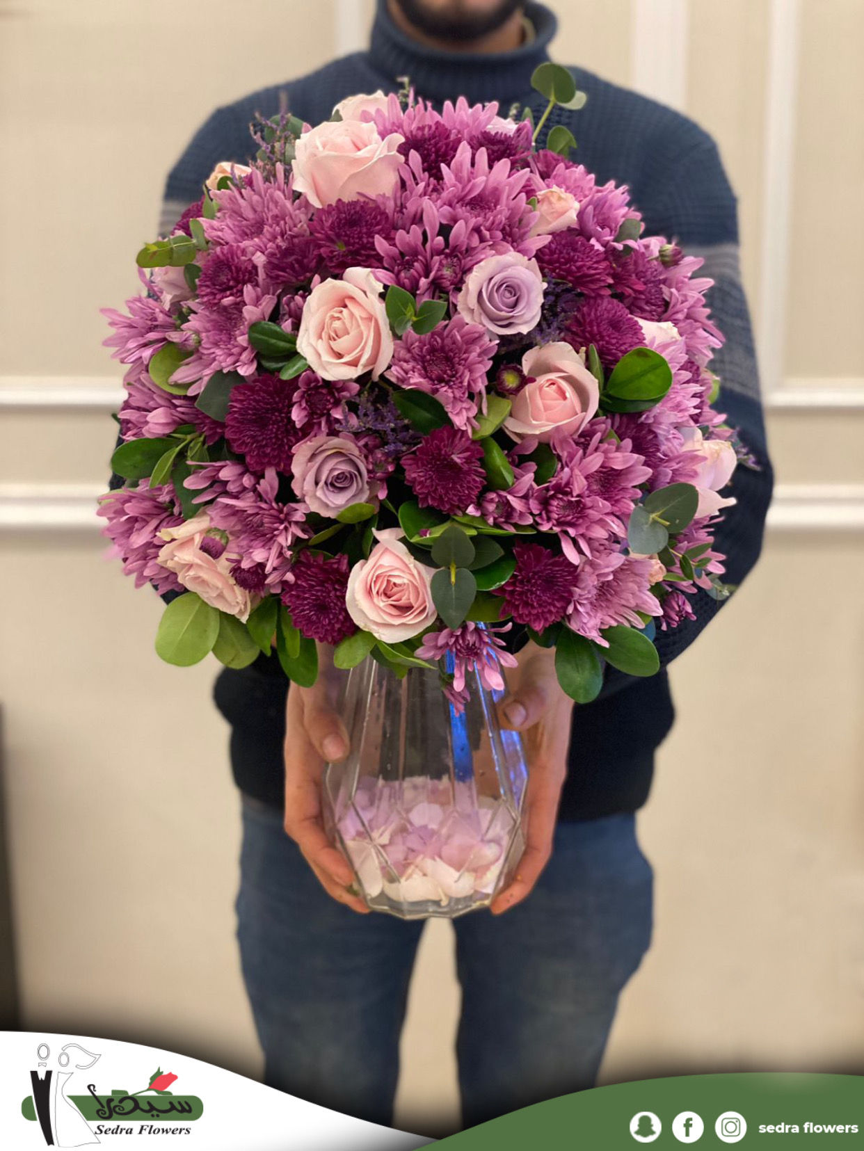 Sunset Serenity vase, vibrant red and sunny yellow flowers.