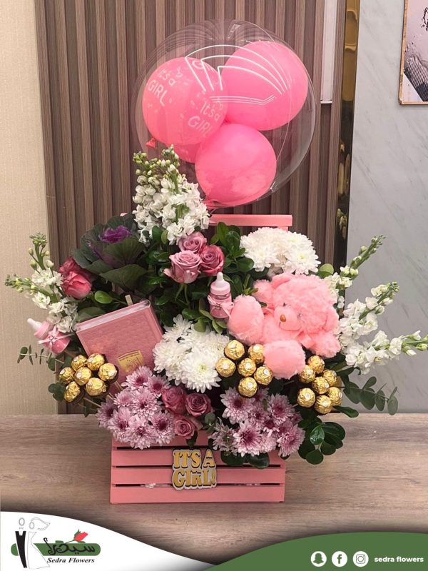 Baby girl arrangement with flowers, chocolate, a pink bear, a Quran, balloons, and a sticker saying it’s a girl.