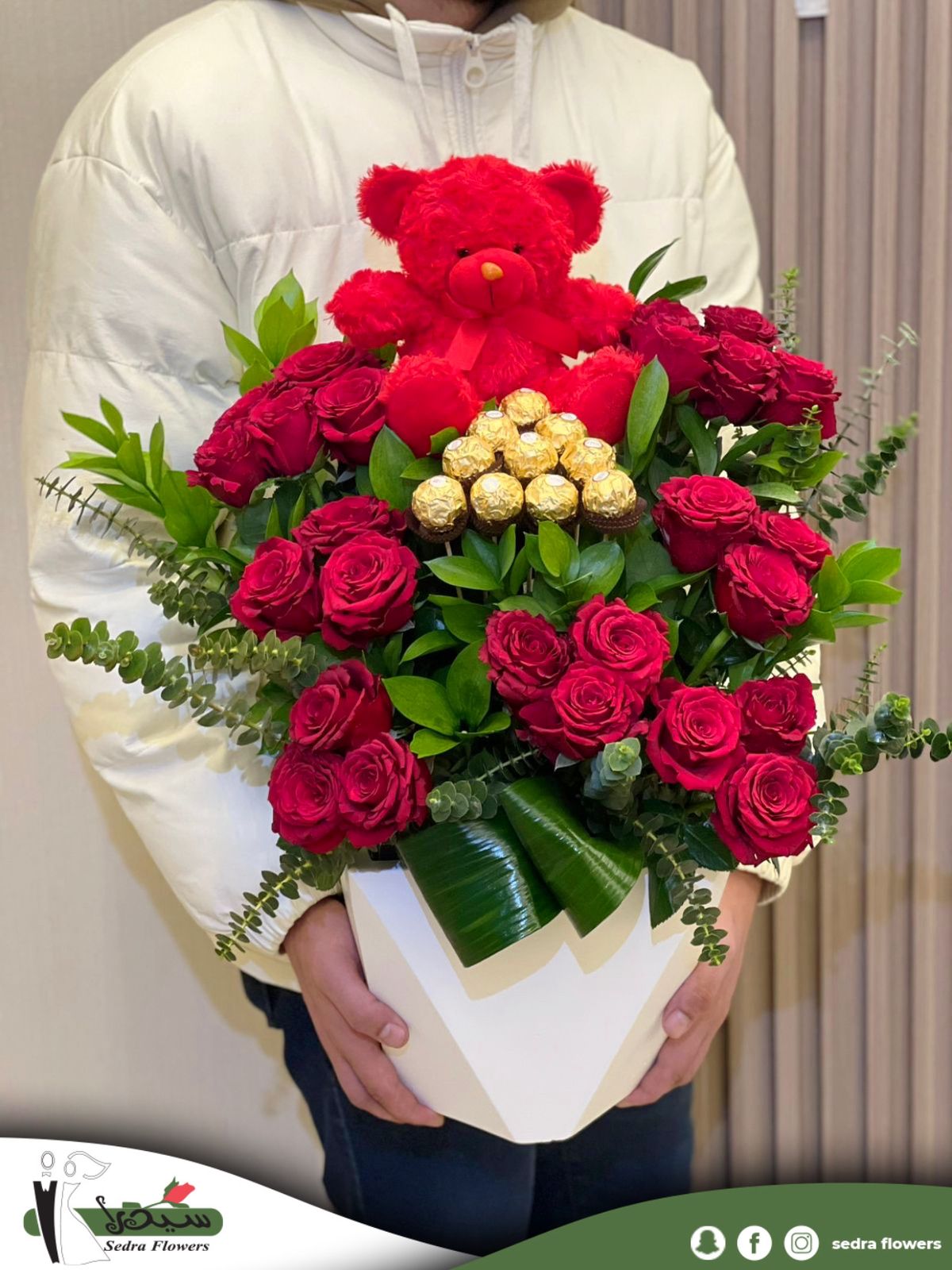 white box, a variety of white and red roses