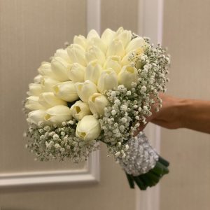 Delicate tulips and gypsophila dance together, creating a bridal bouquet that whispers romance and elegance, a perfect floral to love.