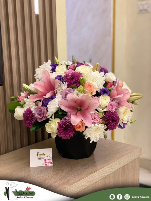 An enchanting mix of pink and purple flowers artfully arranged in a vase, this bouquet is a vibrant and charming expression of beauty. A perfect gift to brighten any space with a touch of elegance.